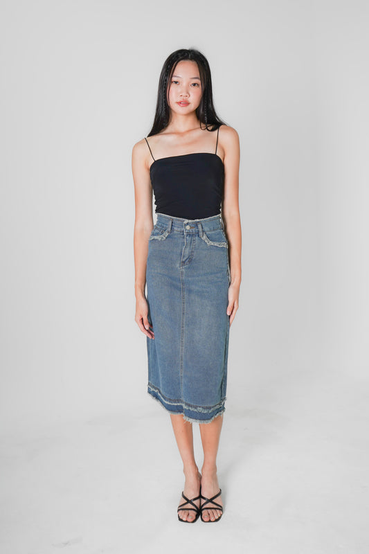 Mirin Frayed Hem Denim Midi Skirt