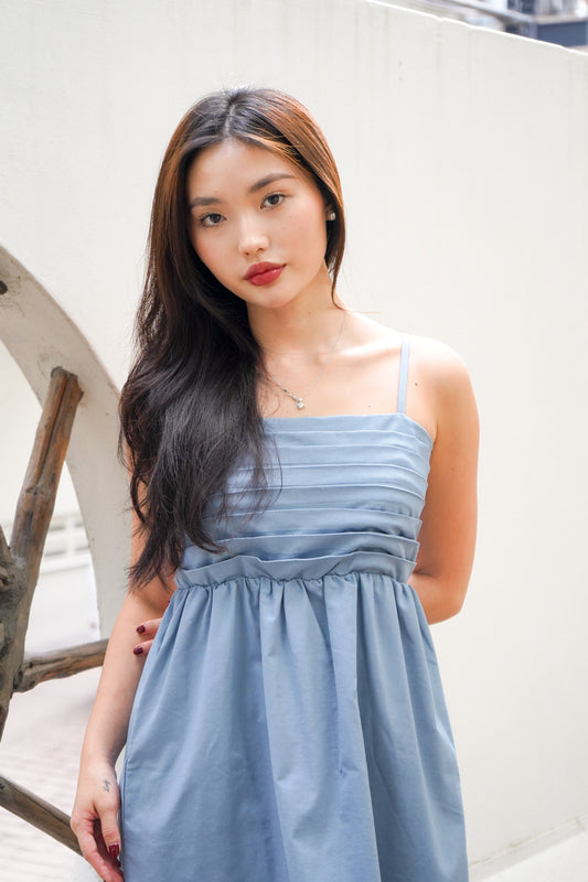 Carmen Pleated Mini Dress (Denim Blue)