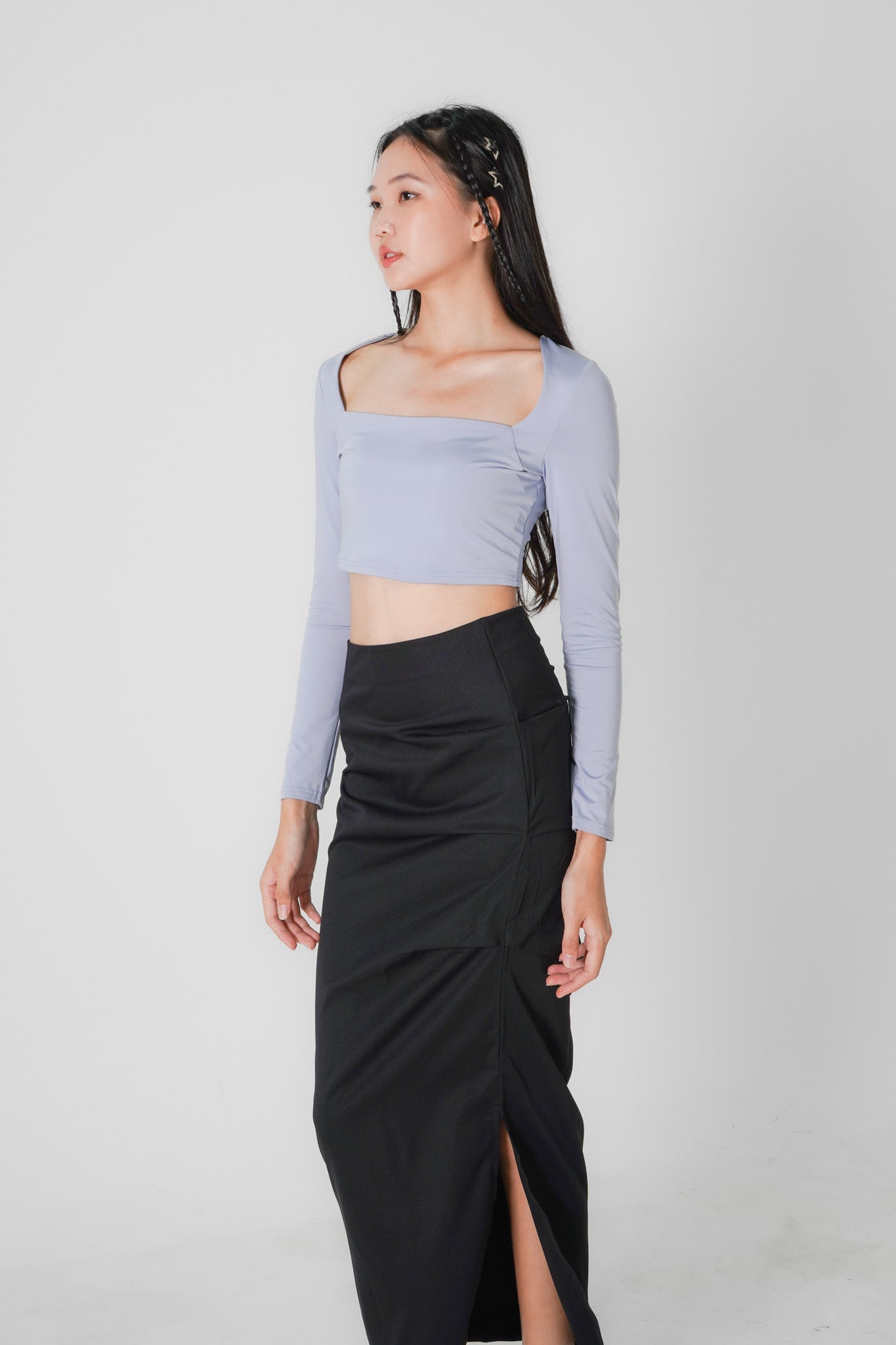 Aniya - is a long, fitted skirt that hugs the body closely in a pencil silhouette. Designed with a slight ruched detail on the top with a slit till knee cap area to add that stylish, sultry element to the skirt so it can can be worn in both formal and casual settings. Pair with blouses, crop tops, or fitted shirts for a sleek and elegant look.