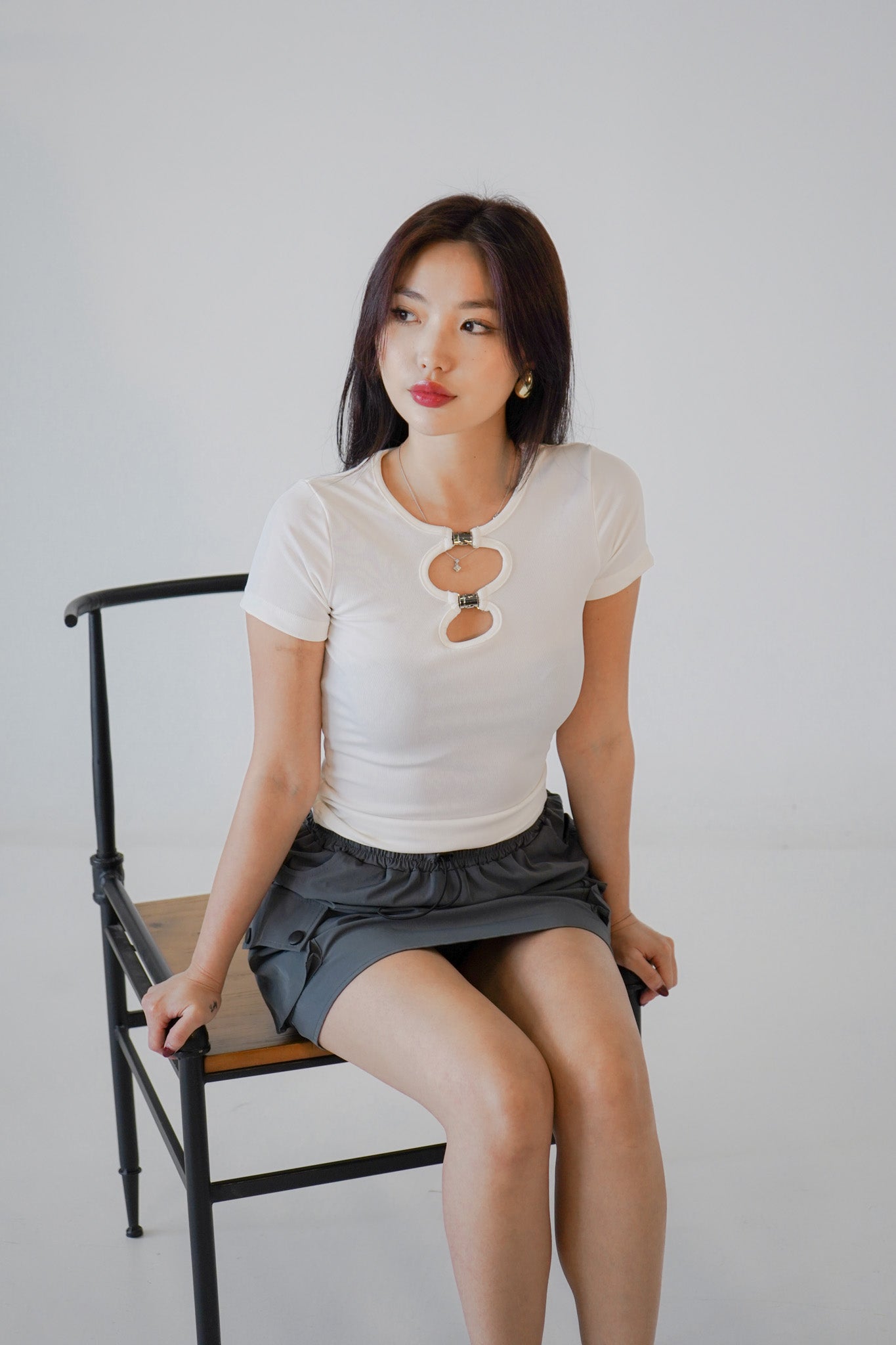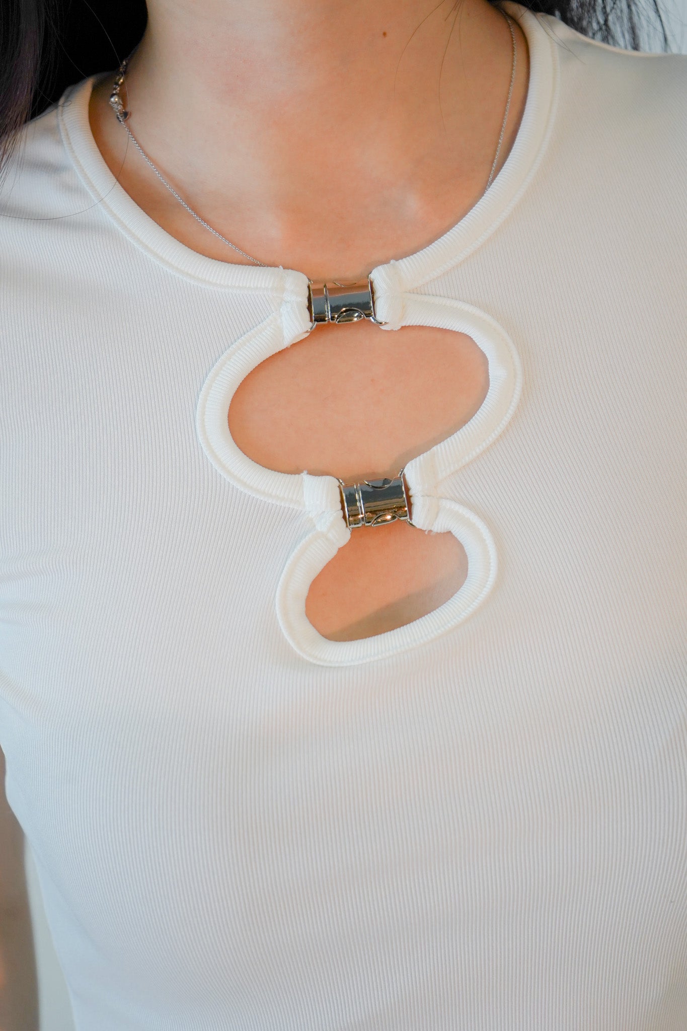 A spin off from your traditional shirt - the cutout adds a trendy and edgy element to the overall piece. Designed with metal buckles to connect the cut-out sections or simply as decorative elements, adding an industrial or punk-inspired vibe.