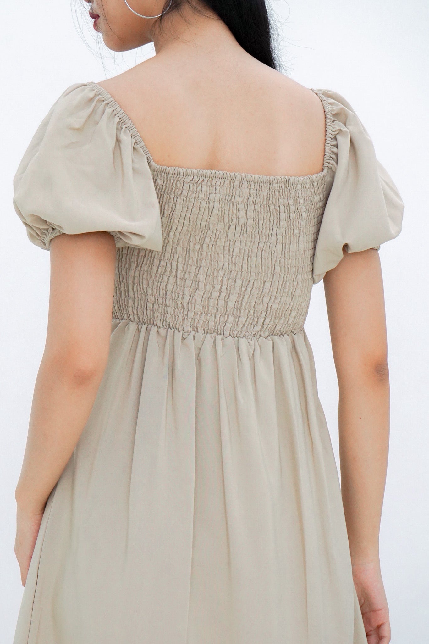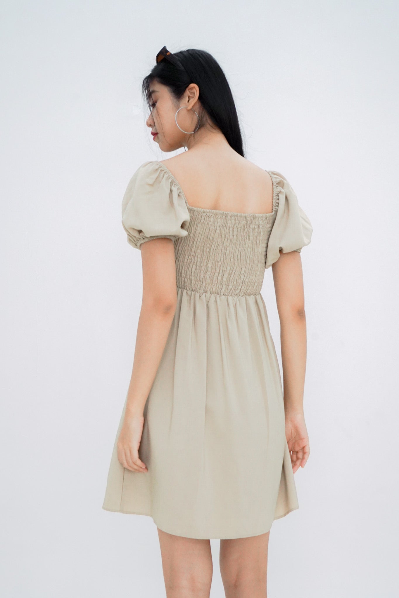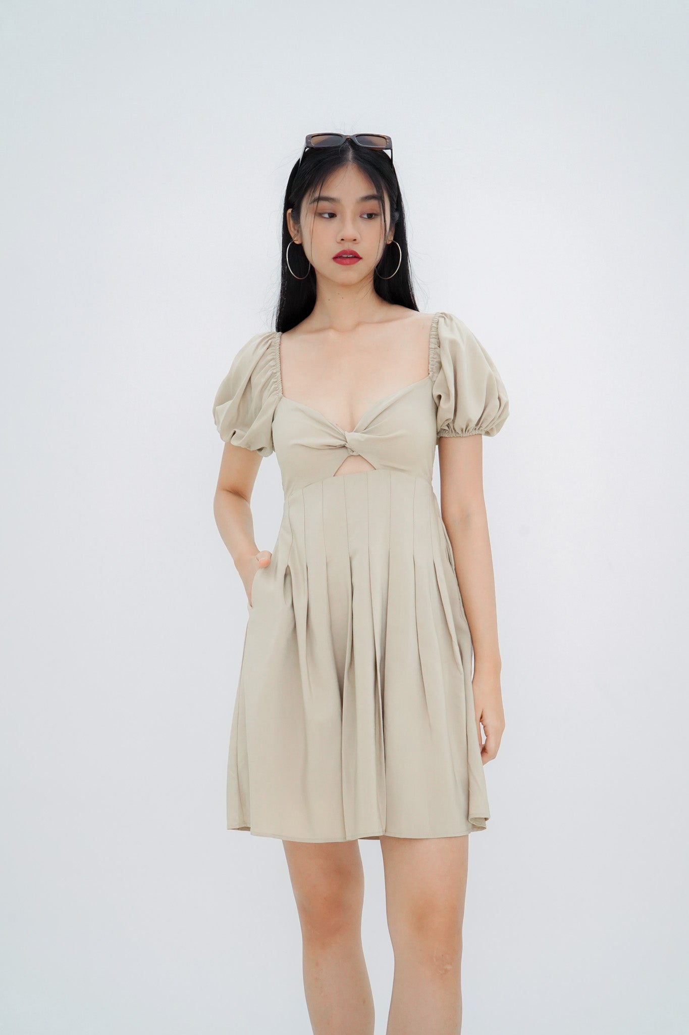 Dakota Padded Puff Sleeve Dress with Cut-out (Khaki)