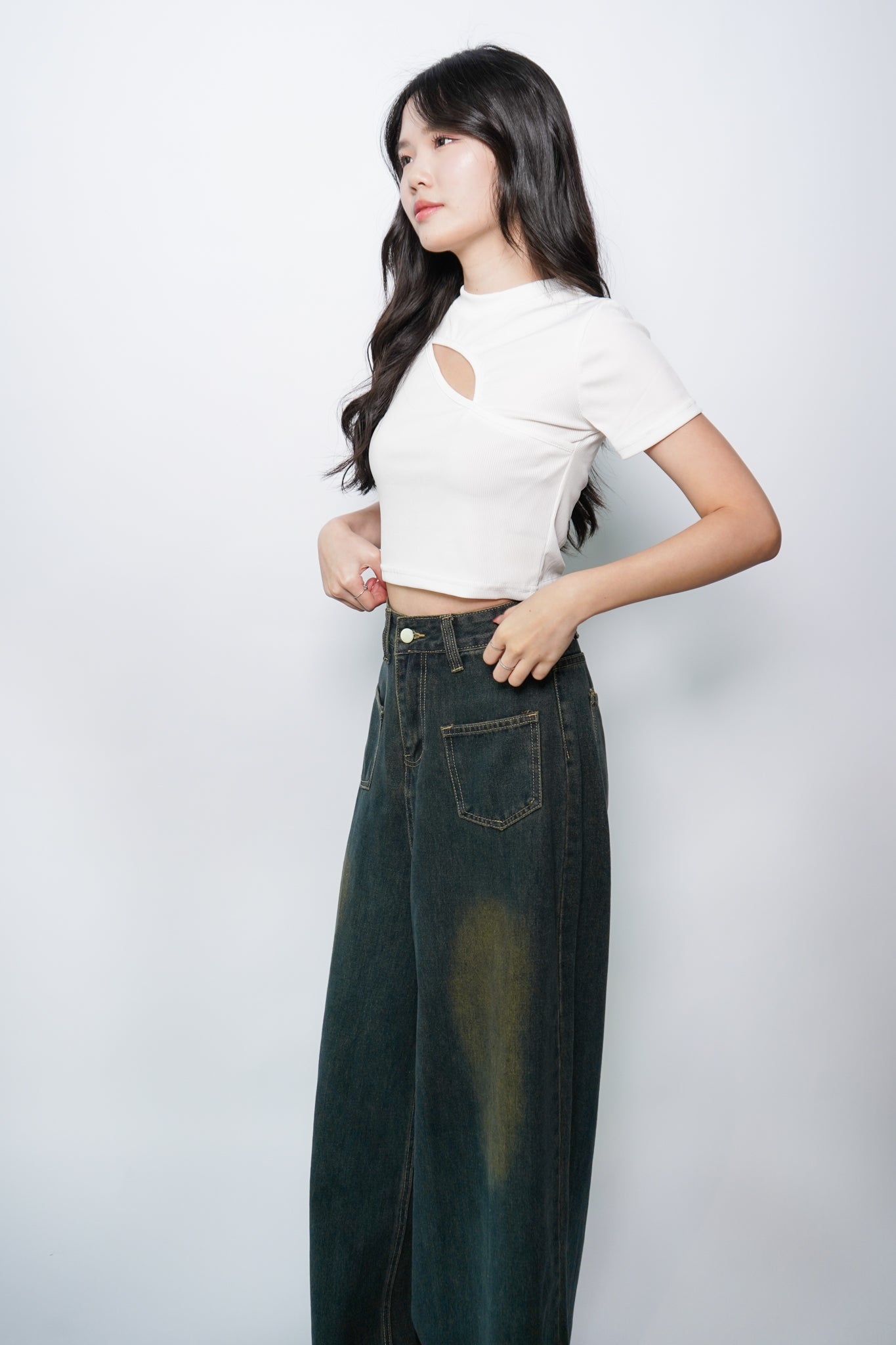 Darcy Mock Neck Cut-out Rib-knit Slim Crop Top (White)