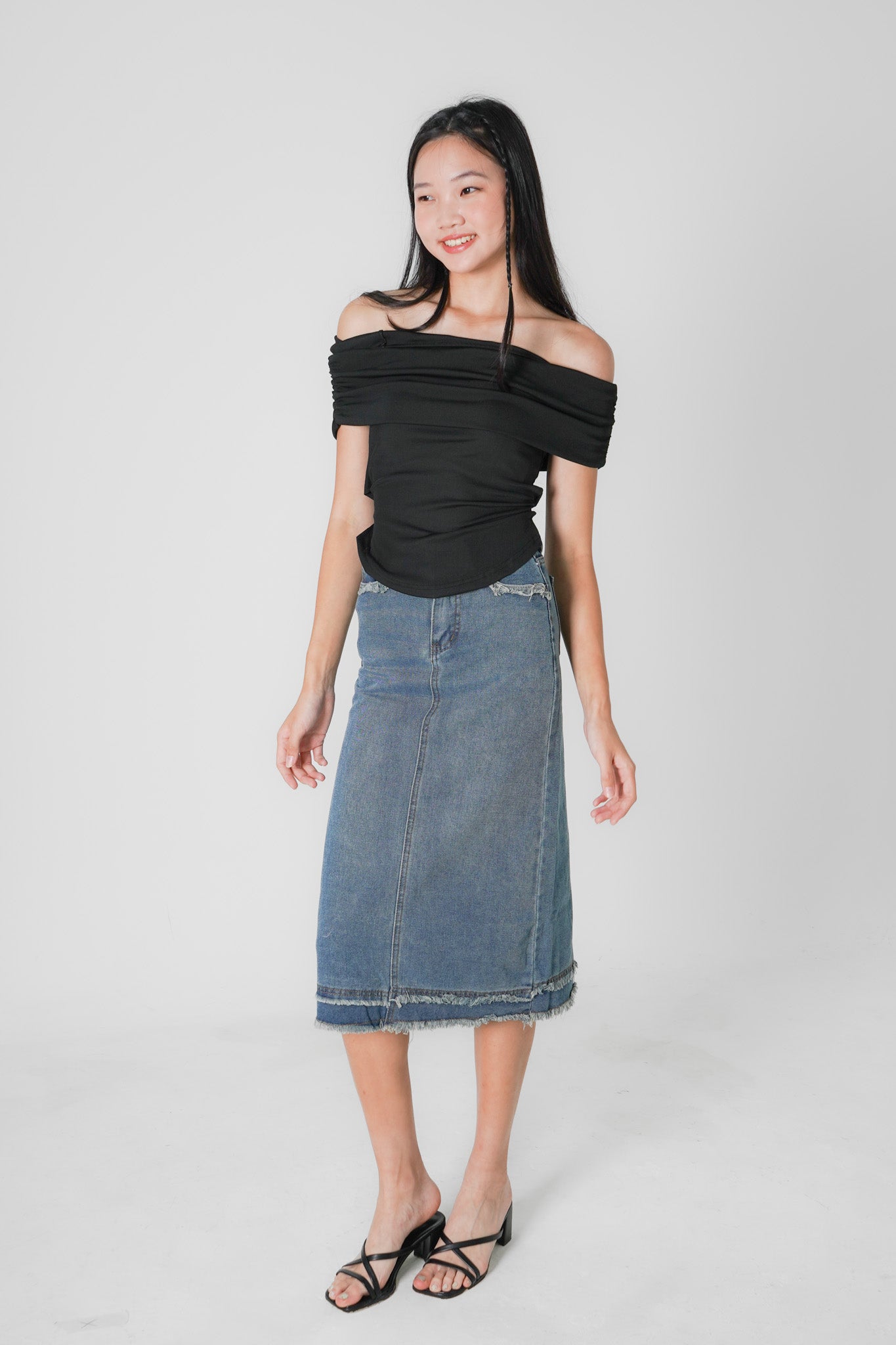 Never go wrong with a stylish and feminine wardrobe piece that highlights the shoulders - a signature feature, this style emphasizes the collarbone and shoulders for a soft, elegant look. Surprise at the back with 3 stripes for that twist! Be like us and create a balanced, boho-inspired look by tucking a fitted off-shoulder top into a frayed hem denim maxi skirt.