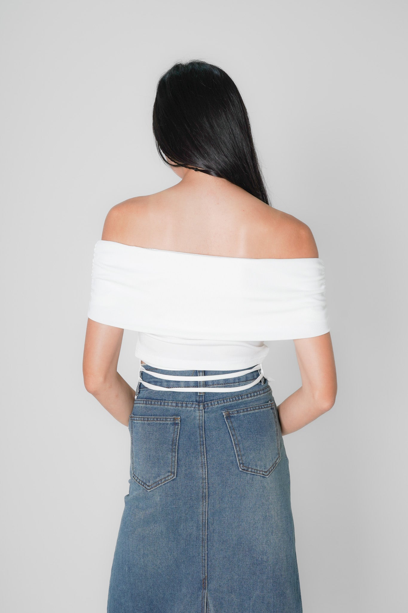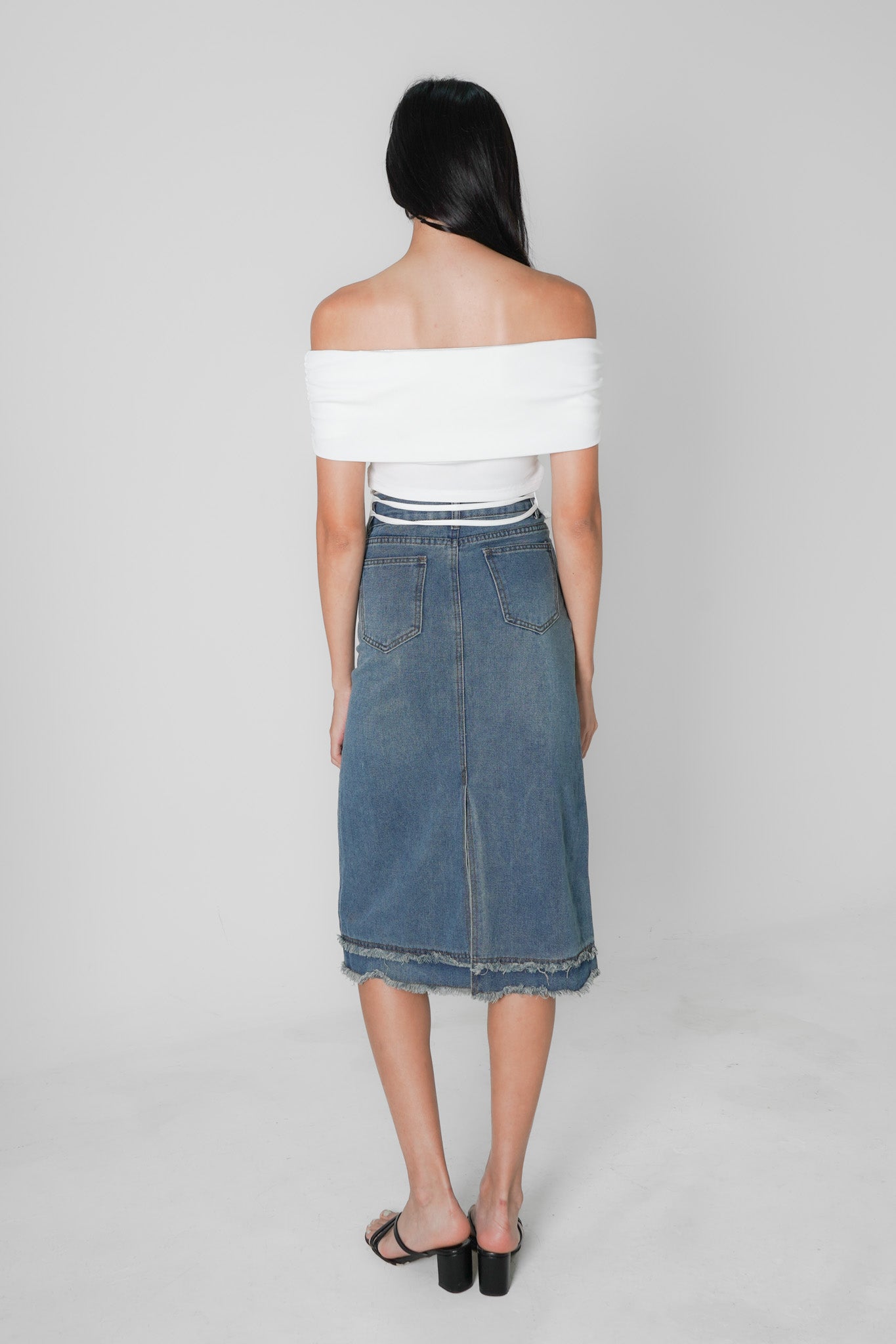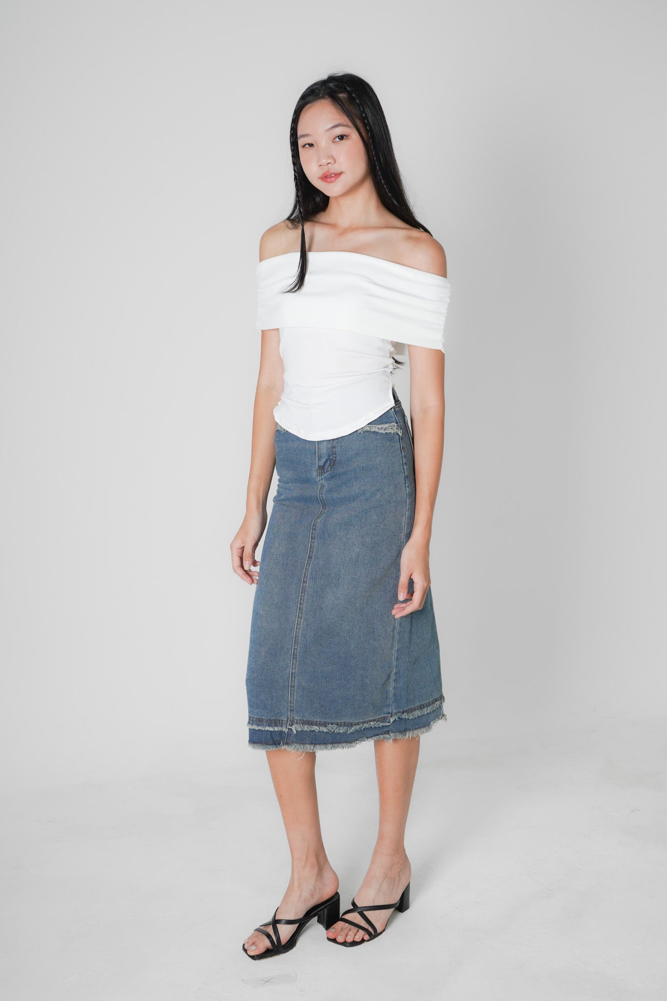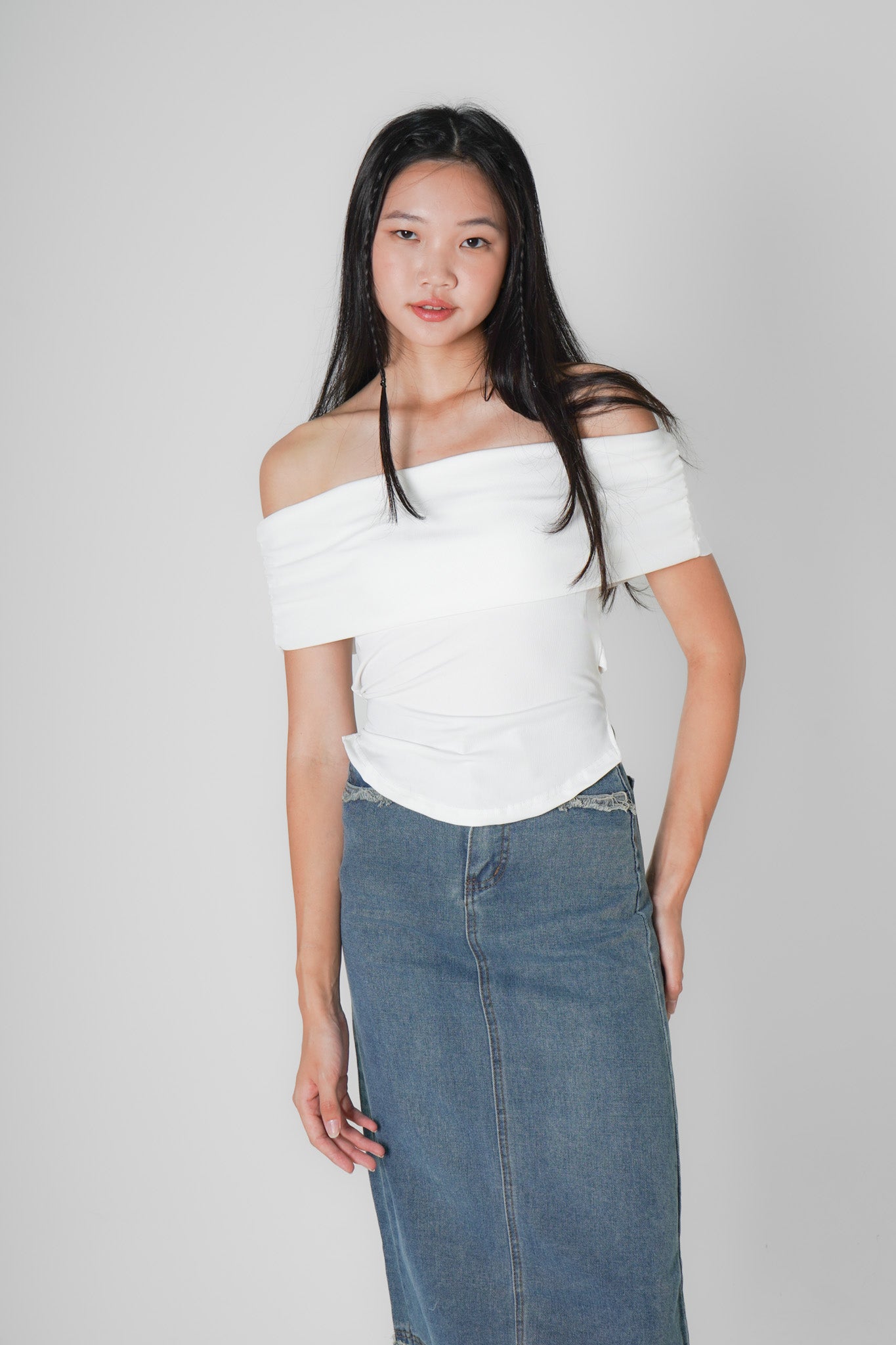 Never go wrong with a stylish and feminine wardrobe piece that highlights the shoulders - a signature feature, this style emphasizes the collarbone and shoulders for a soft, elegant look. Surprise at the back with 3 stripes for that twist! Be like us and create a balanced, boho-inspired look by tucking a fitted off-shoulder top into a frayed hem denim maxi skirt.