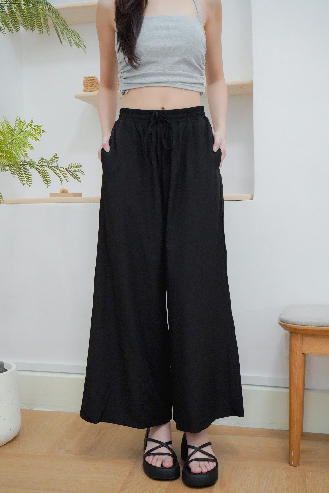 Junia Wide Leg Elastic Waistband Pants (Black)