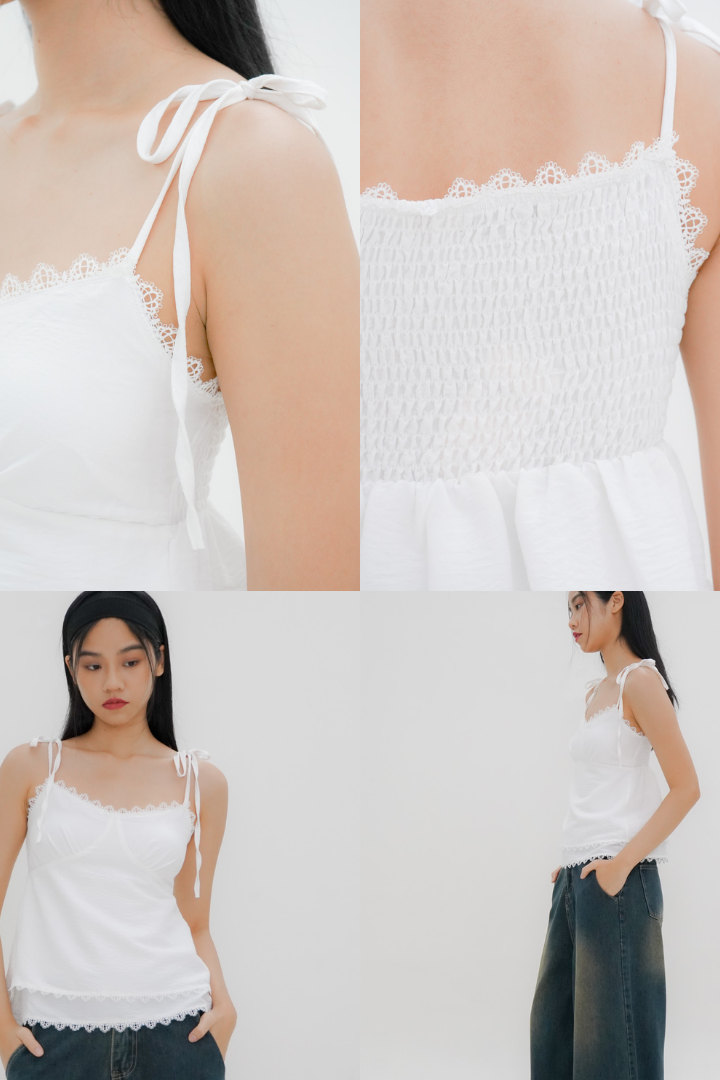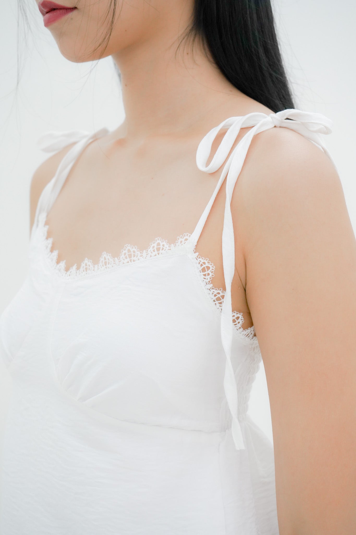 Lily features a tie shoulder detail and lace trimmings at the neck and hemline, exuding a flirty and feminine touch. Lily is fitted at the bust with a smocked back and flares out to an a-line silhouette.