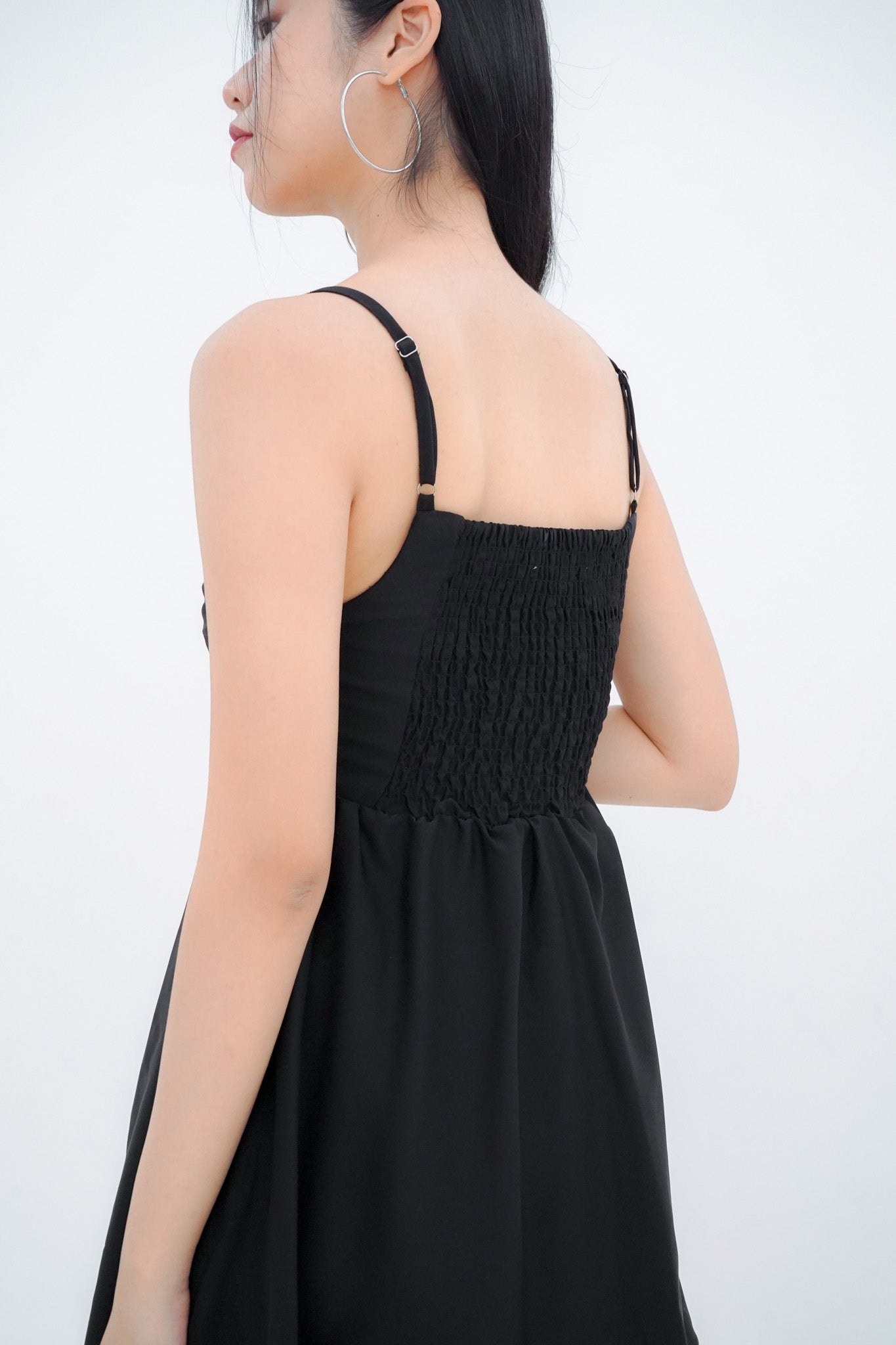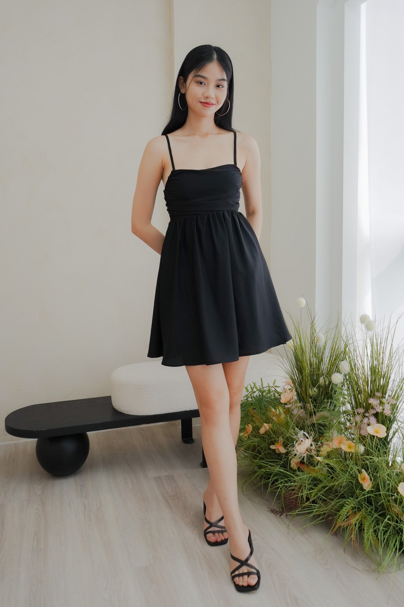 Made with a ruched bust detailing and a gathered skirt with 2 side pockets. Enclosed with a side zip and a smocked back for comfort. Maisie is perfect for dinner and dates, pair with our Ayla Tie Front Cardigan to complete the look.