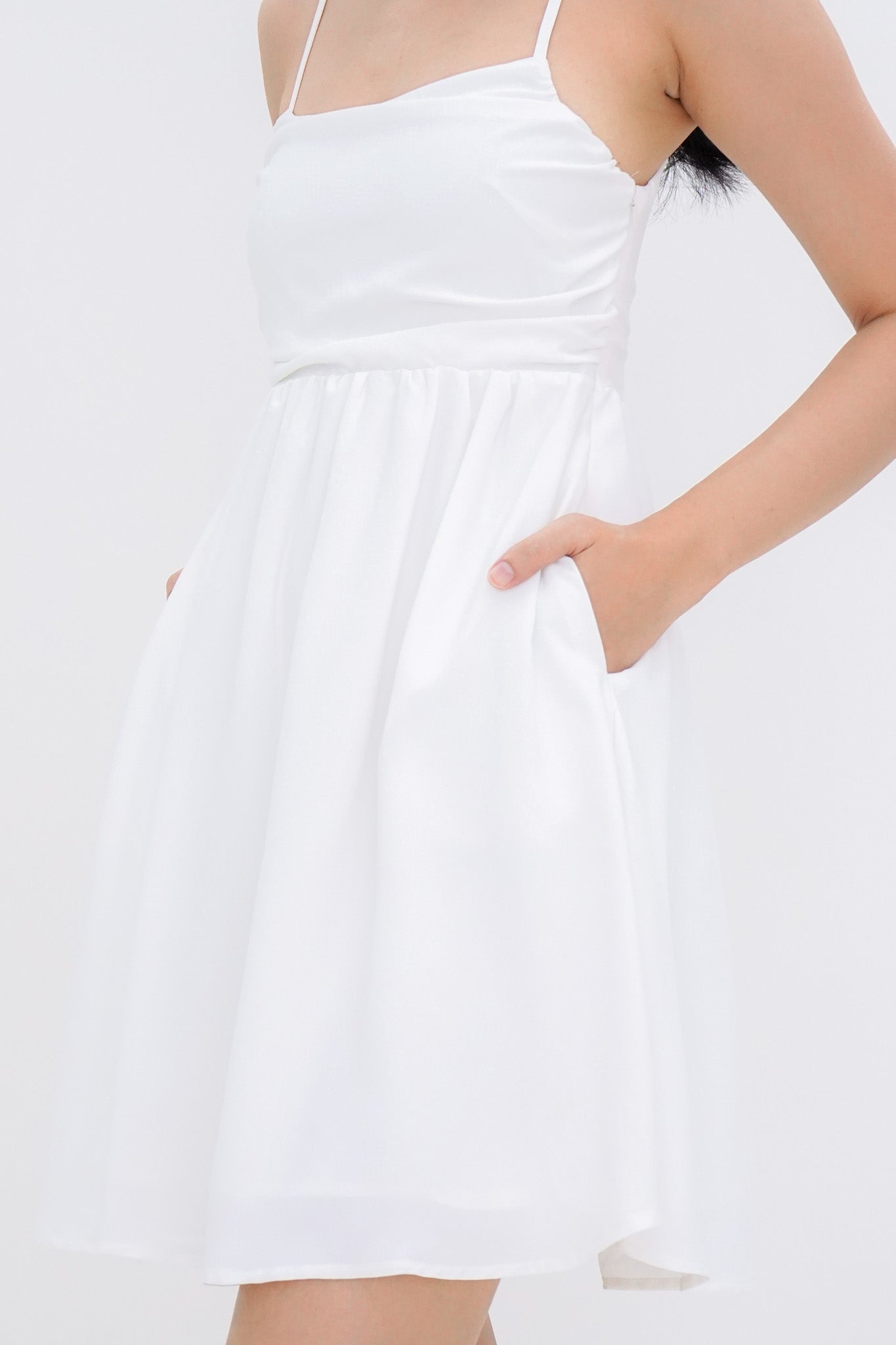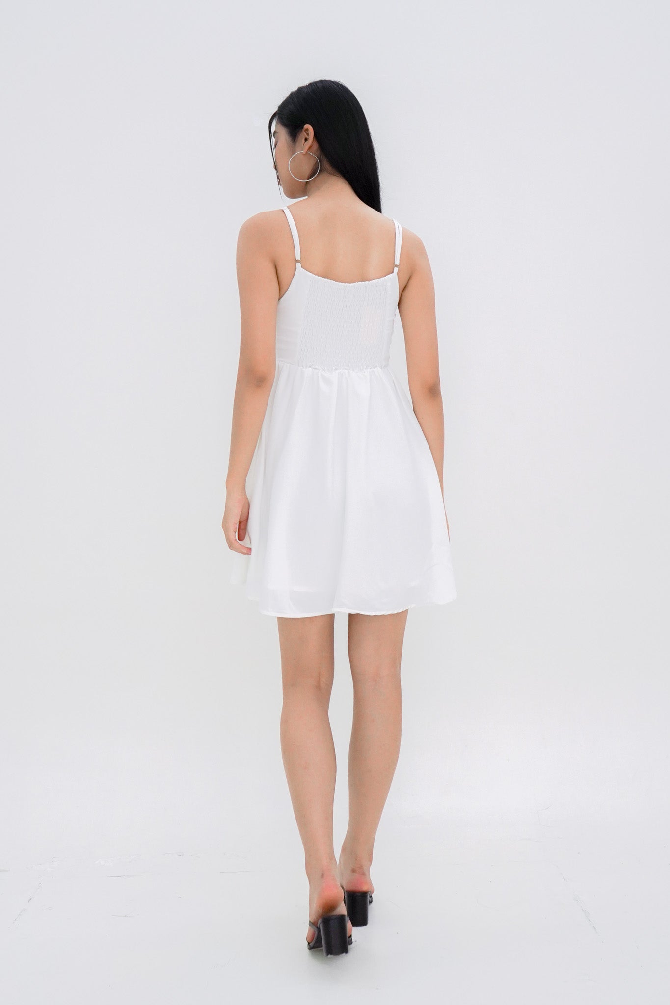 Made with a ruched bust detailing and a gathered skirt with 2 side pockets. Enclosed with a side zip and a smocked back for comfort. Maisie is perfect for dinner and dates, pair with our Ayla Tie Front Cardigan to complete the look.
