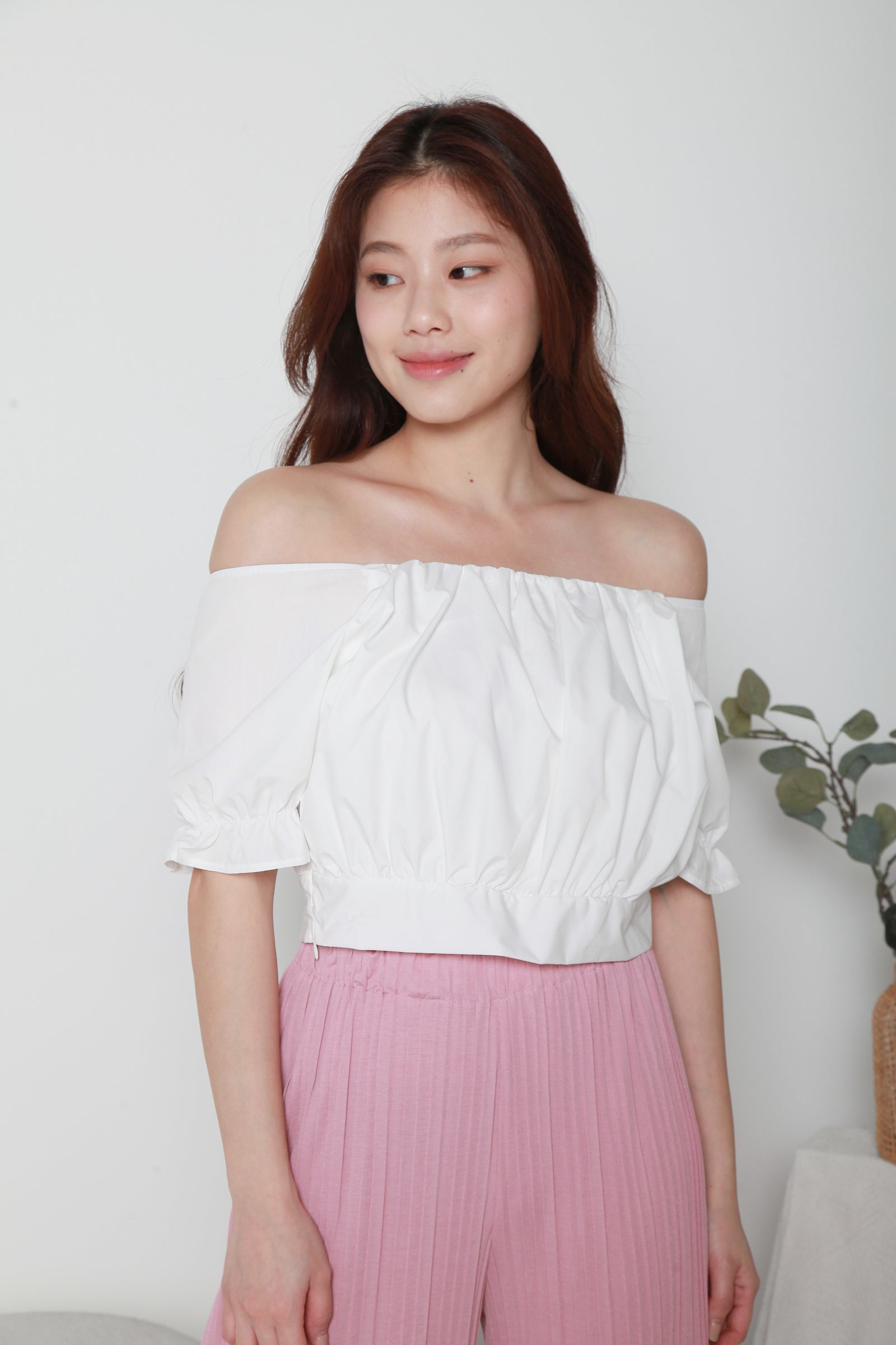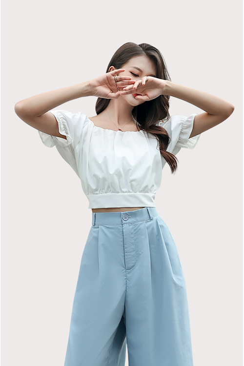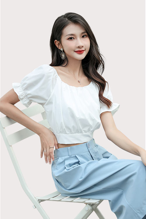 Uniquely designed with a ruched round neckline and puffed sleeves, this trendy crop top deserves a place in your wardrobe. Match it with our basic wide leg cropped pants for a chill and casual look. Side zip included for easy wearing, and lining included so this is non-sheer.