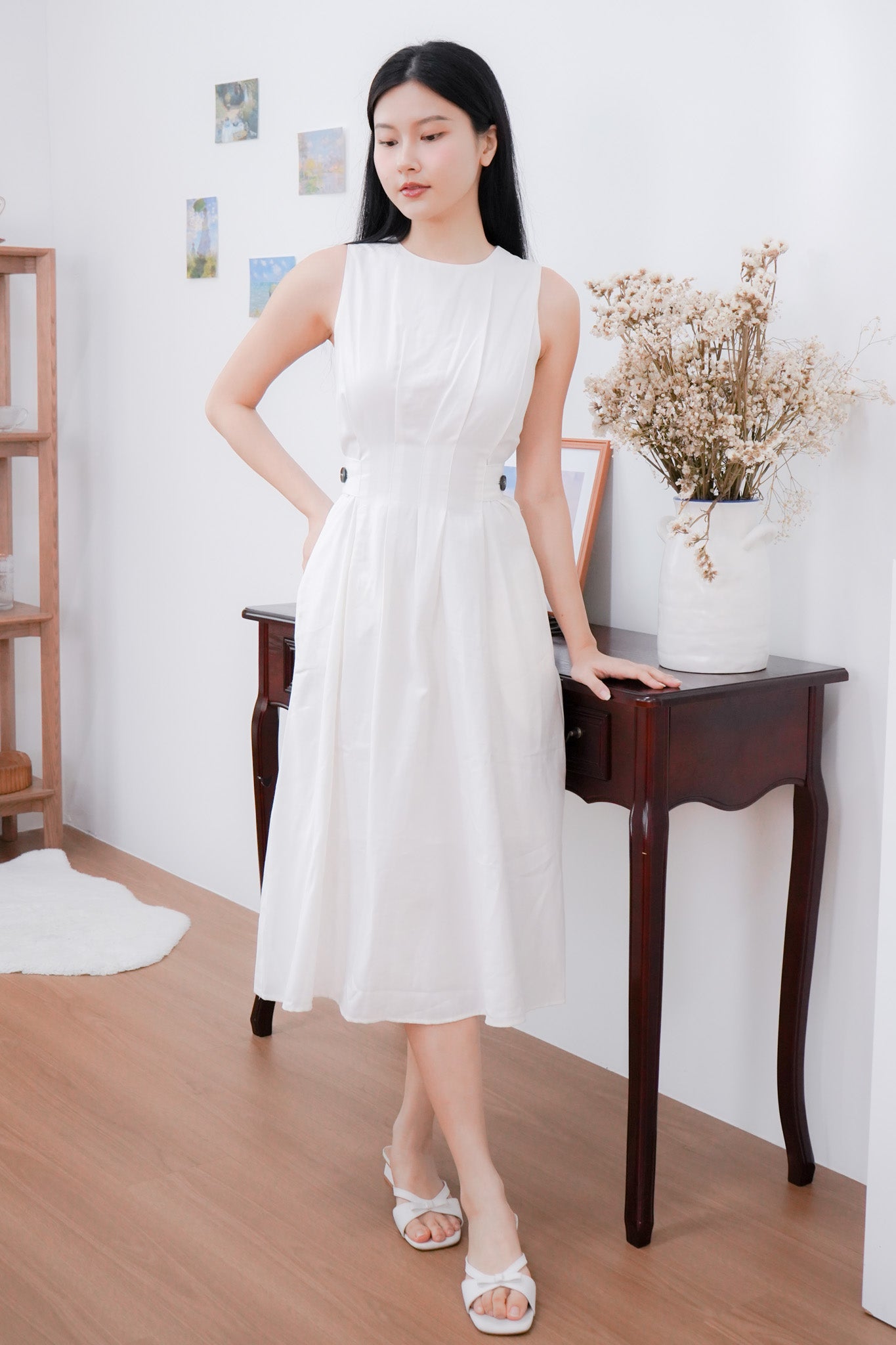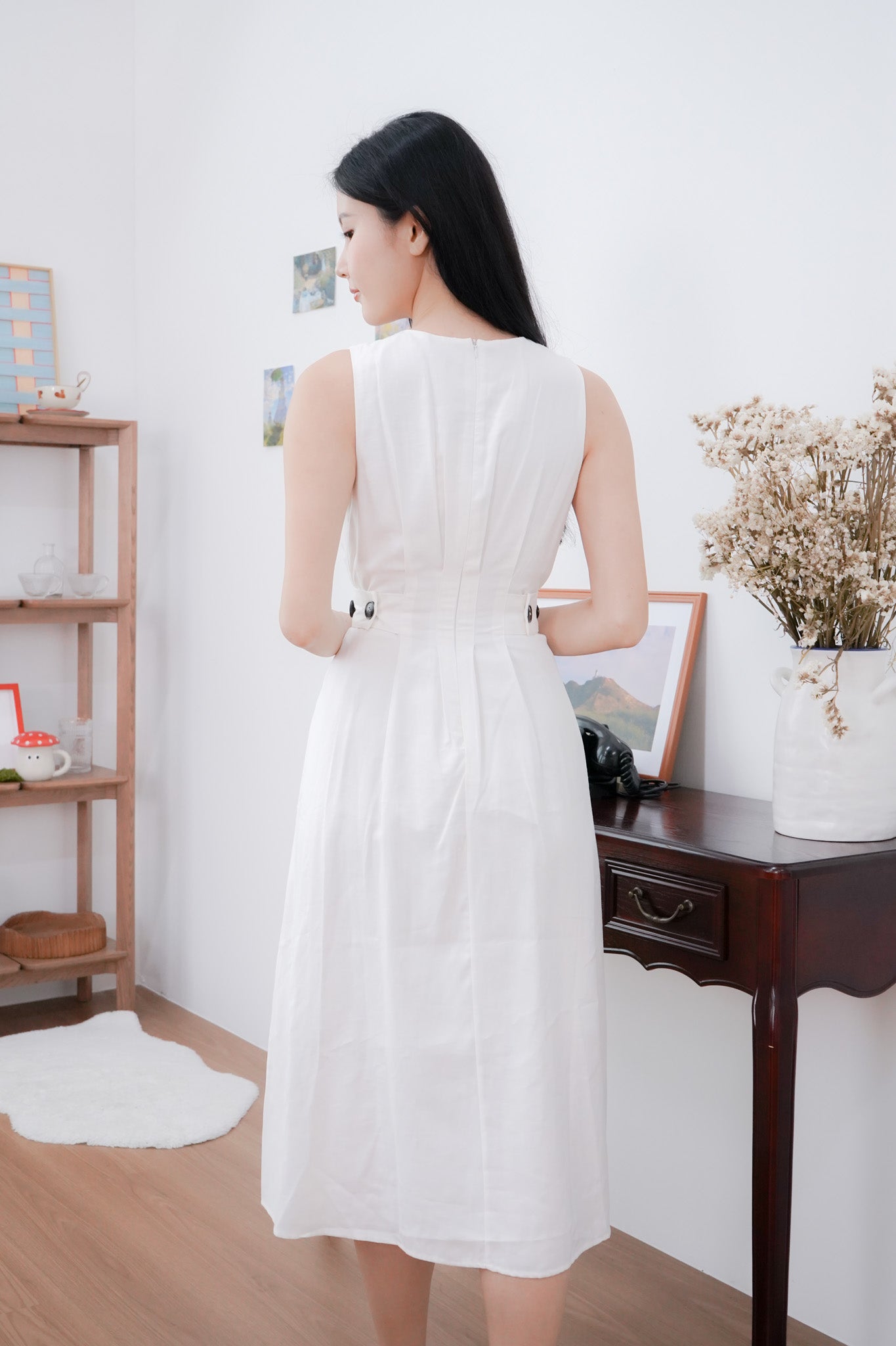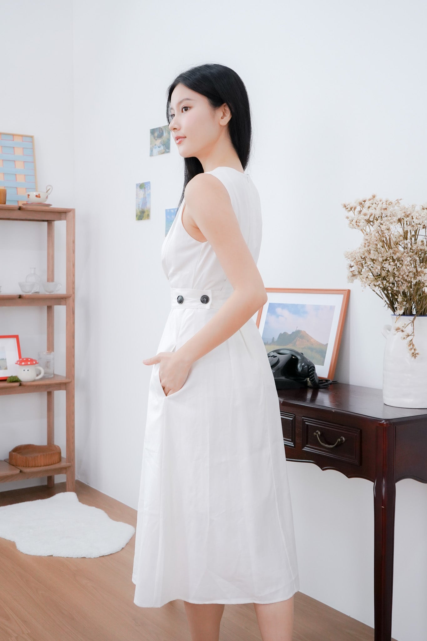 Stand out in this white retro pleated sleeveless midi dress as you stroll down the streets. This dress is designed with unique adjustable straps with buttons at both sides of the waist, and functional pockets.
