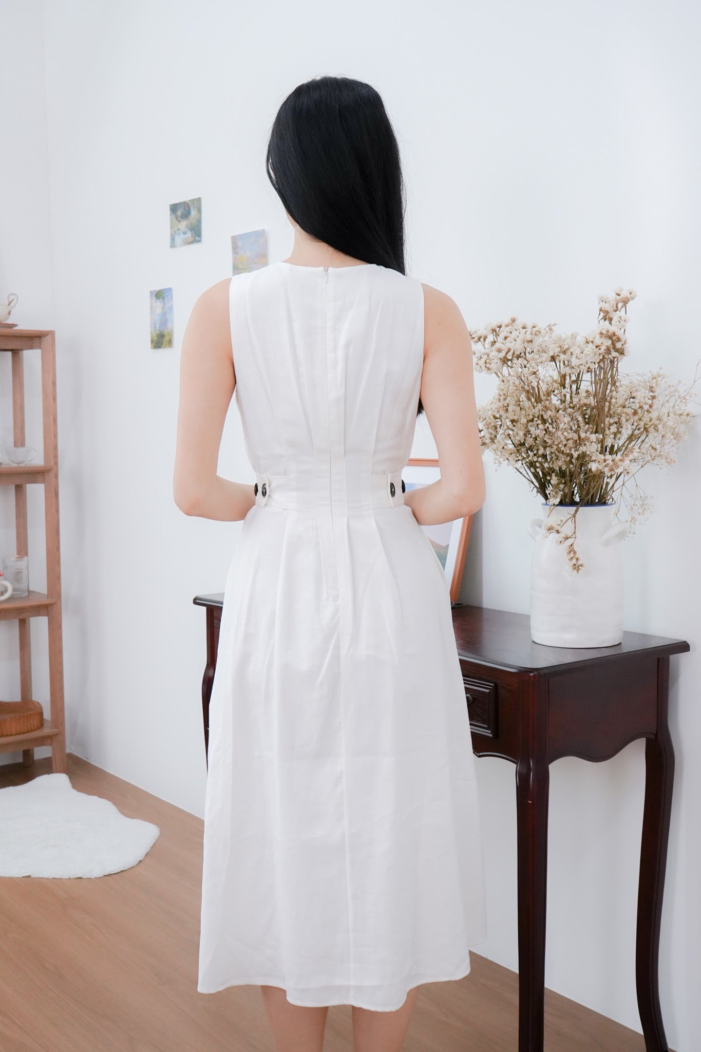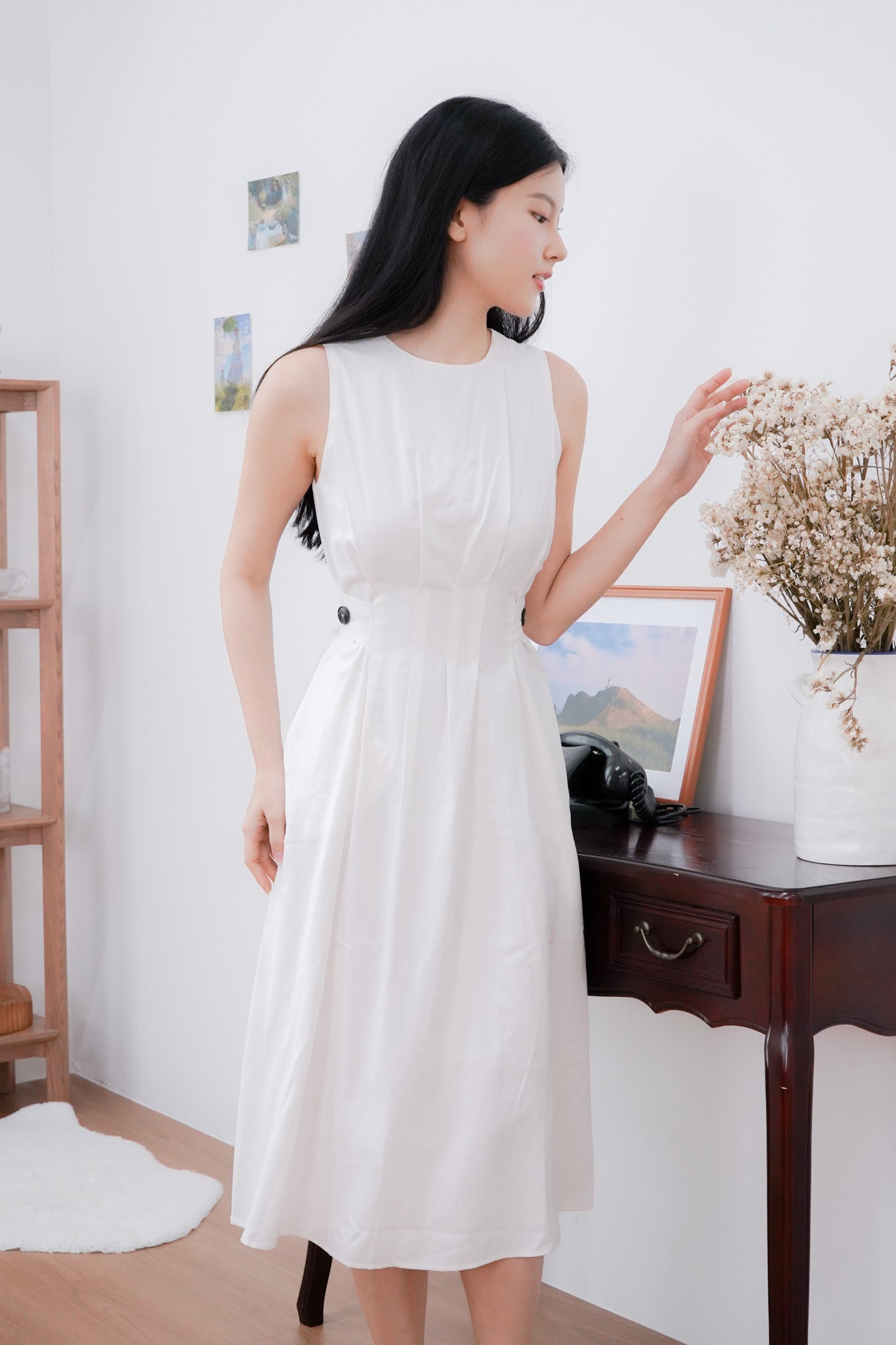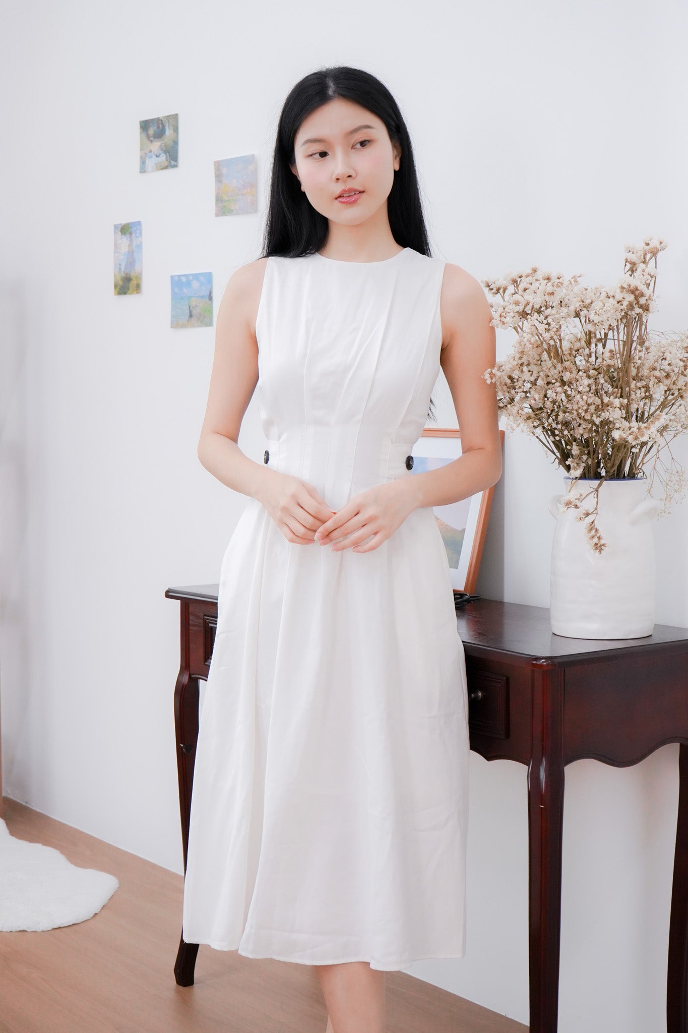 Stand out in this white retro pleated sleeveless midi dress as you stroll down the streets. This dress is designed with unique adjustable straps with buttons at both sides of the waist, and functional pockets.