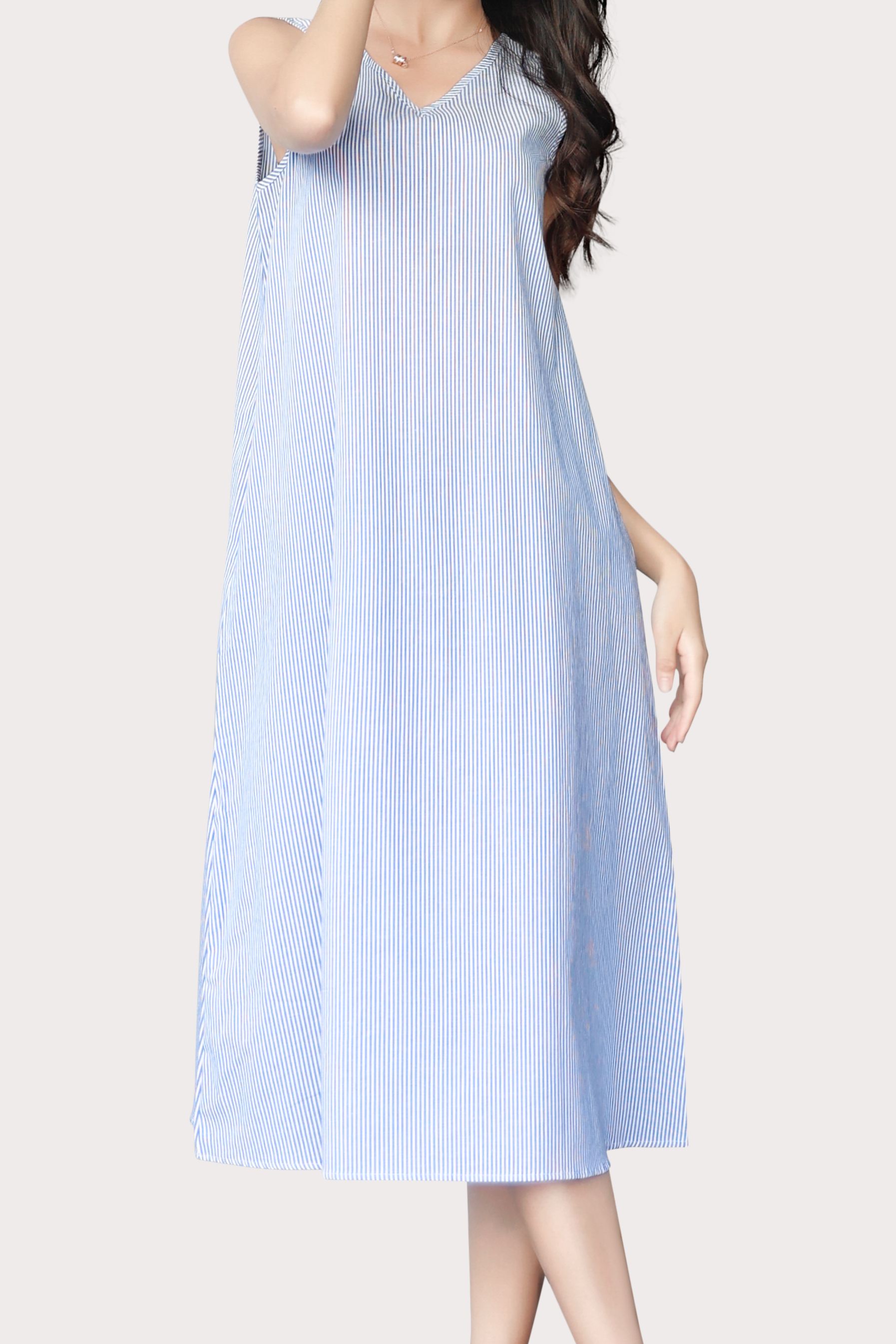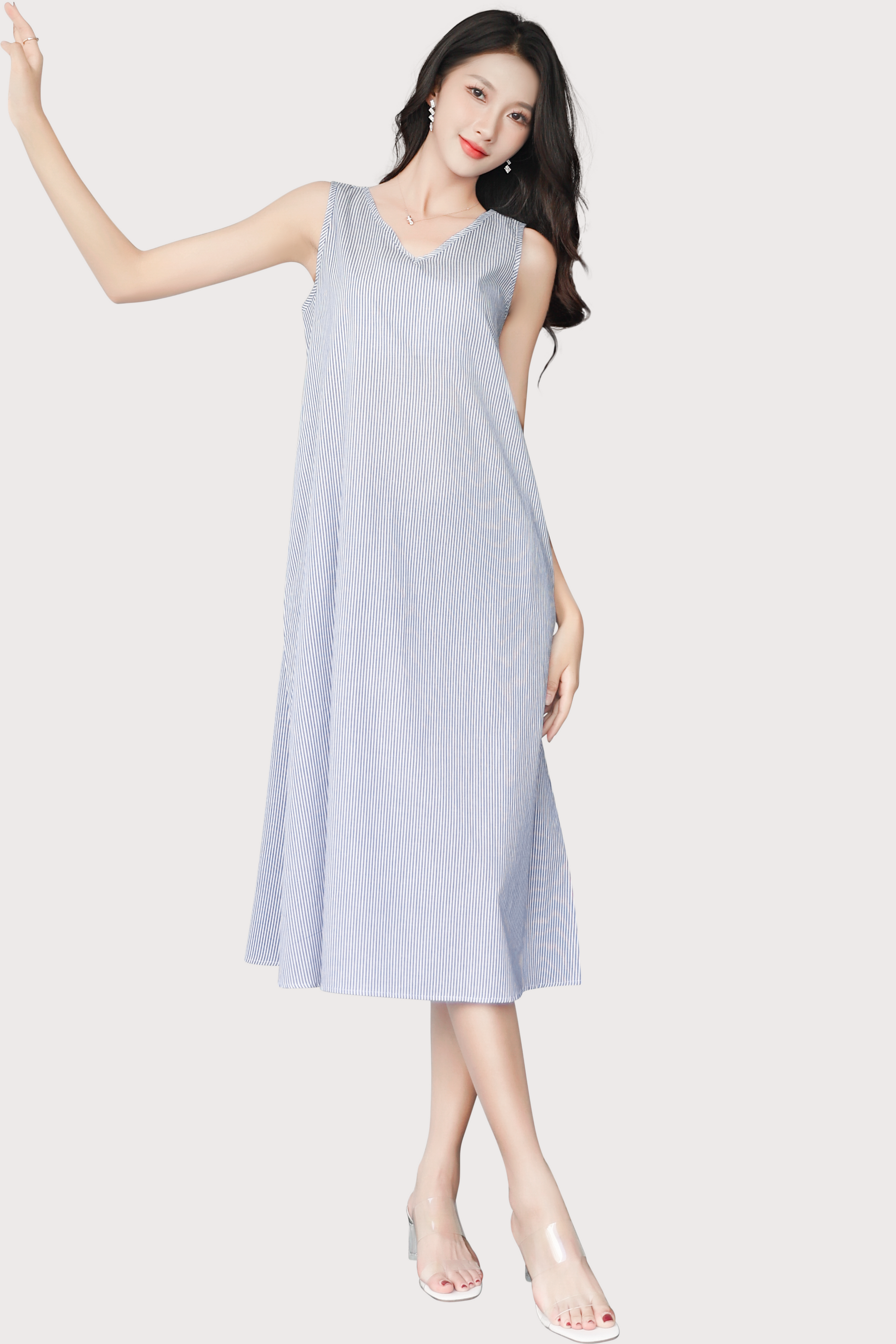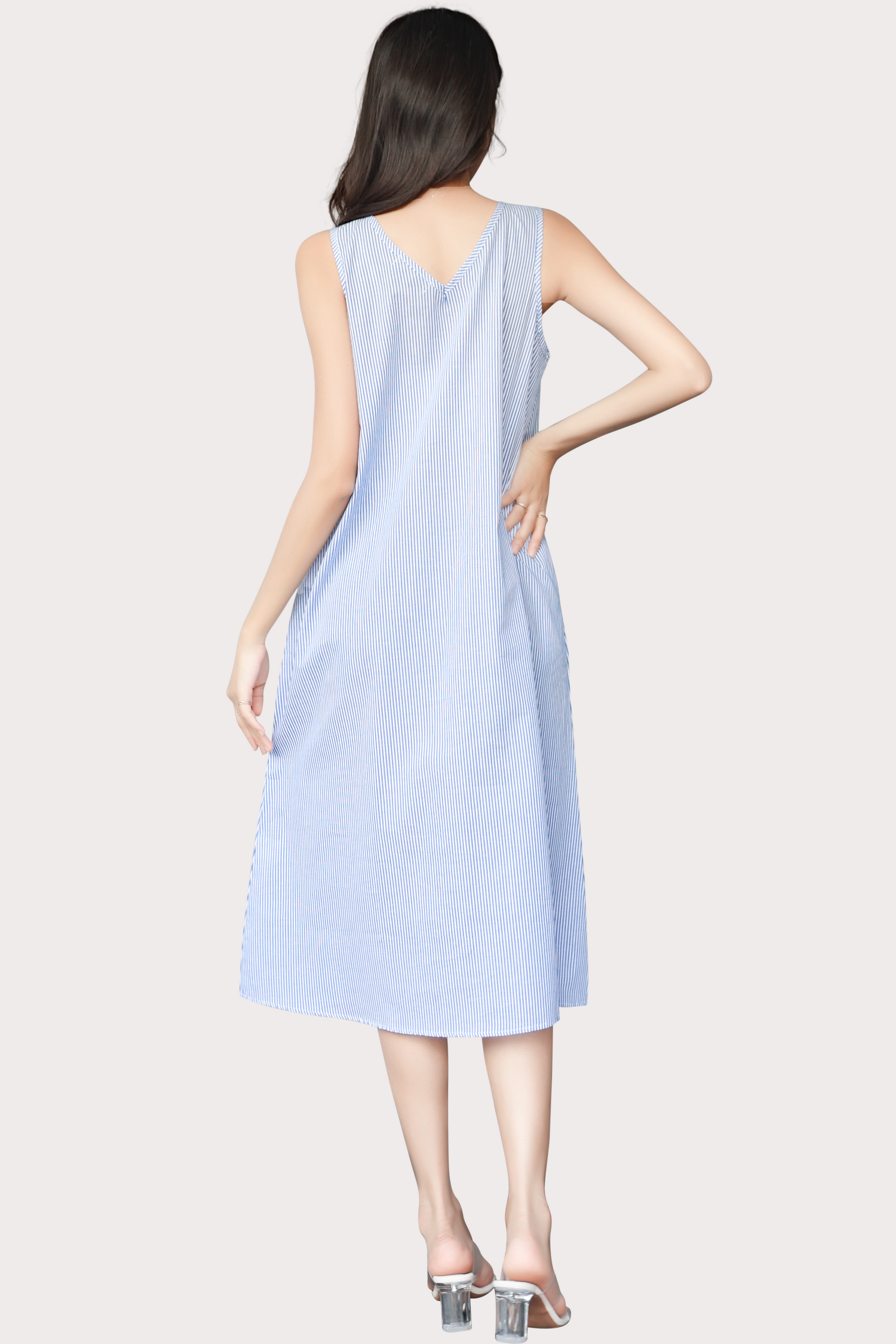 On days when you just wish to feel relaxed, you can slip into this sleeveless striped midi with ease. No zipping required, and this dress comes with functional side pockets. Suitable for casual occasions and buffet-friendly.