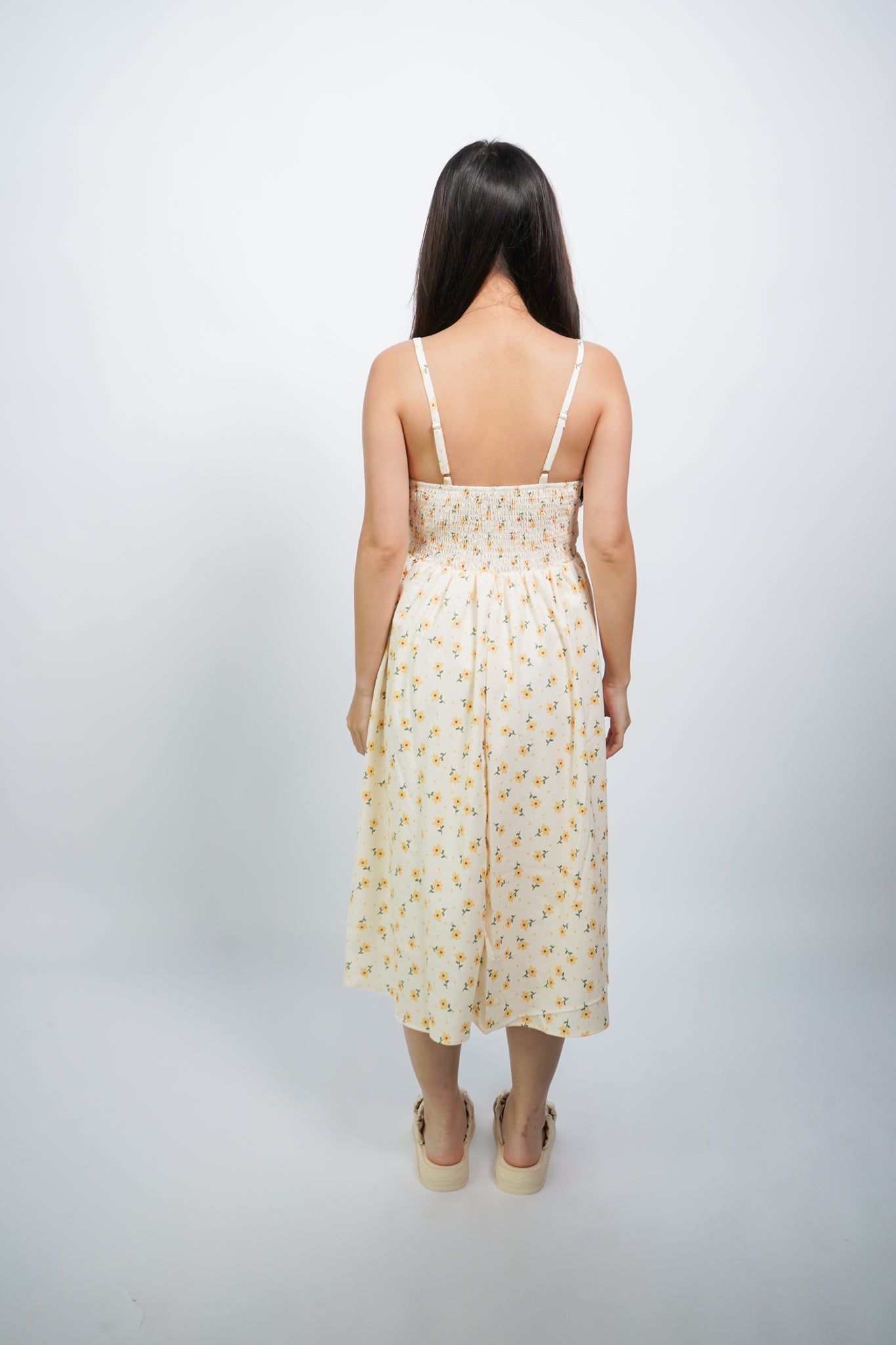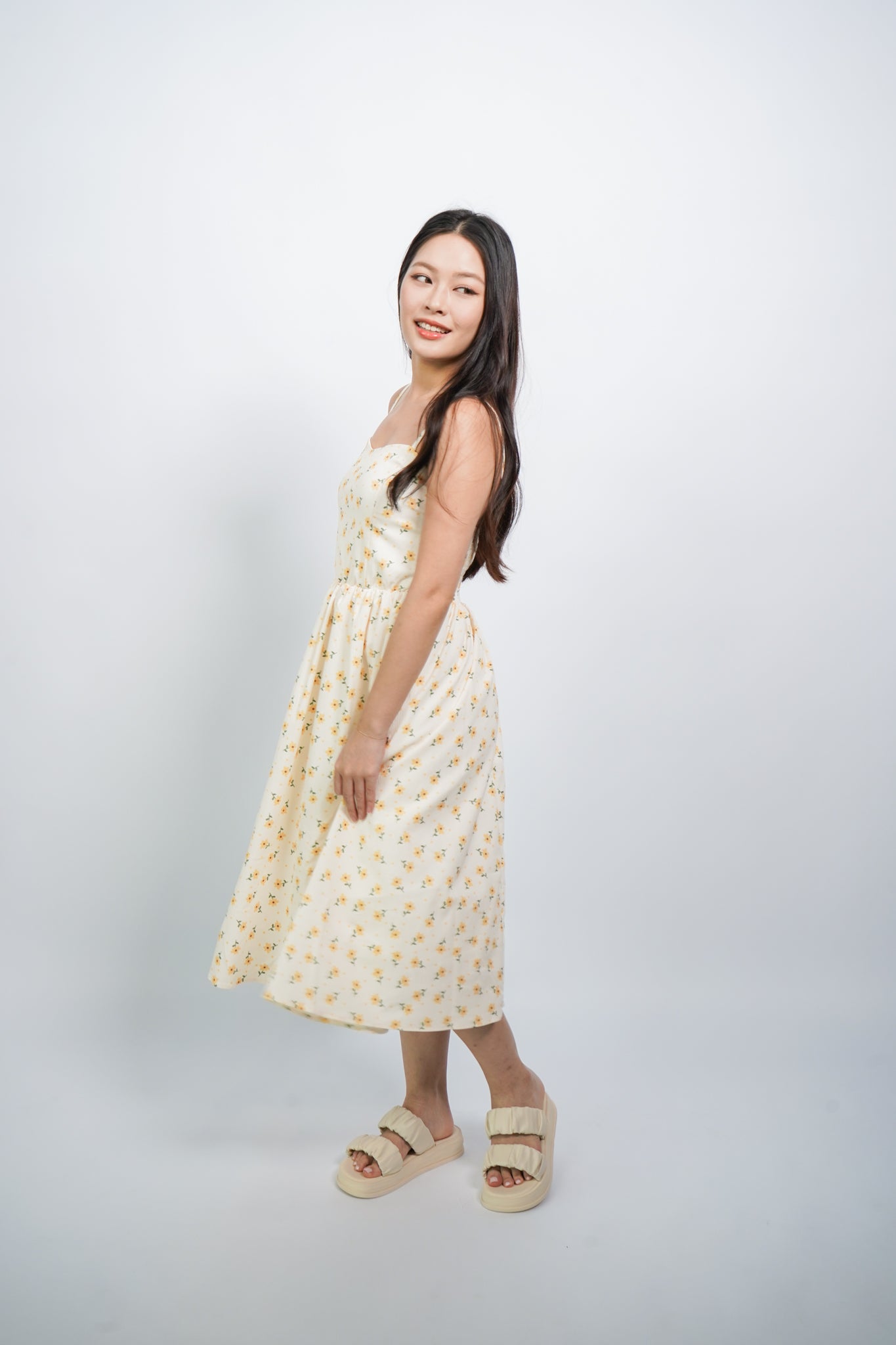 Walk on sunshine in this radiant floral sleeveless dress which features an unique rounded sweetheart neckline. The cheery prints and colour of this midi dress will drive the blues away. Suitable for outings, picnics and days when you wish to brighten yourself up.